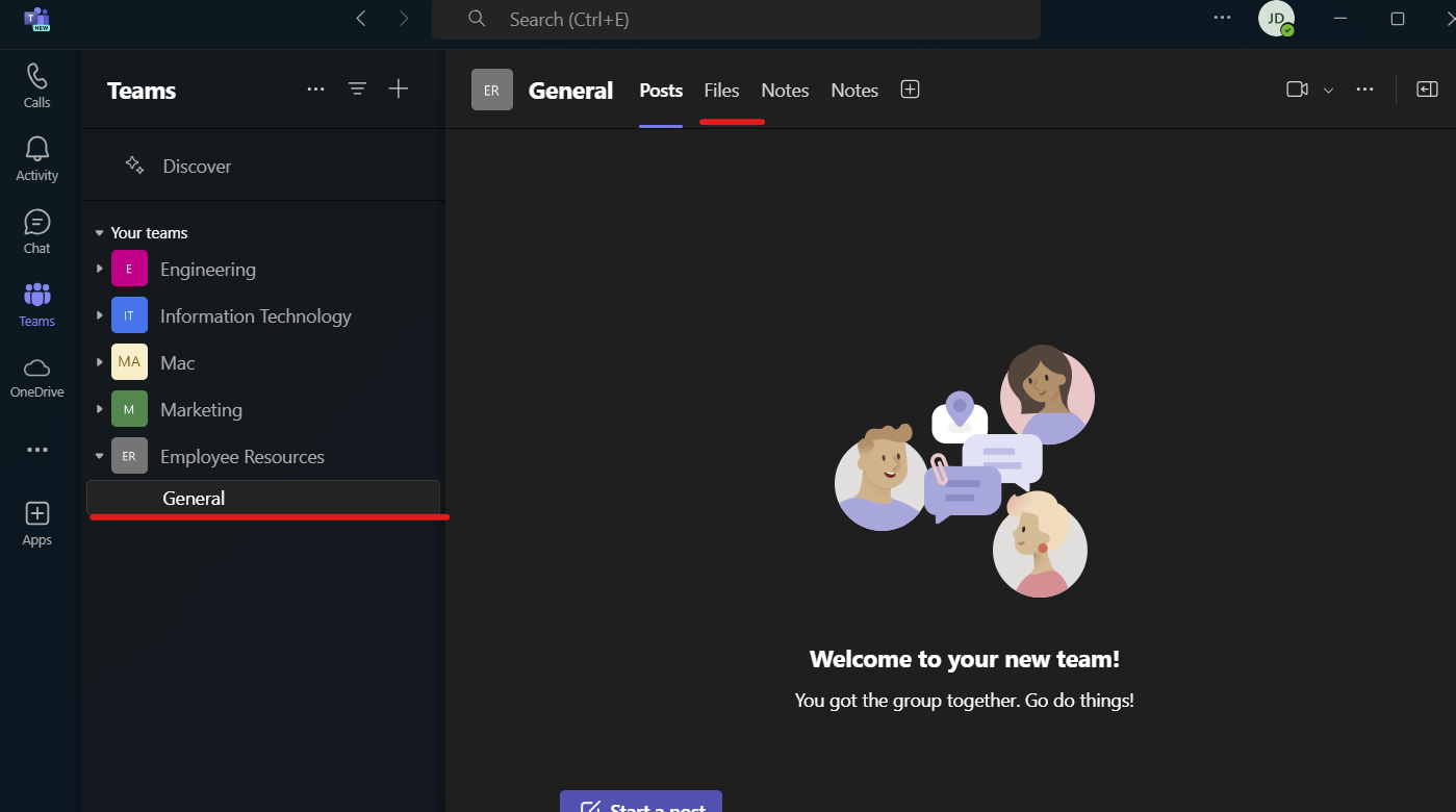 3. Find the team you want to sync to OneDrive and open it then click Files at the top