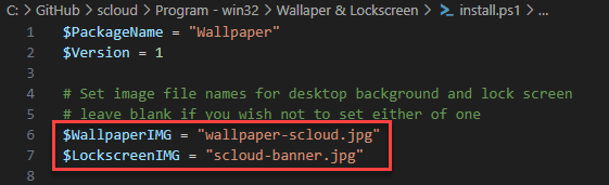 2. Now that you have uploaded your images to the Data folder, open the install.ps1 script. This is a powershell script that will install the wallpaper once it is deployed to the computers. On lines 6 & 7, find wall paper image and lock screen image. Update the string to match exact name and file extension from the data folder. Save changes and close.