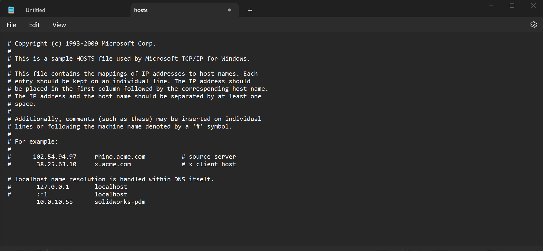 Failed to obtain a license for SOLIDWORKS PDM Standard. Cannot connect to the license server systemthis is solved differently. Start by opening a notepad session in administrator mode. Then in the top left go to File -> Open.C:\Windows\System32\drivers\etc. Make sure to search by all files. At the bottom tab over once and add the ip10.0.10.55and then following withsolidworks-pdm. See image below. Make sure to save changes.