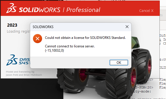 “Could not obtain a license for SOLIDWORKS Standard. Cannot connect to a license server. (-15,10032,0)”