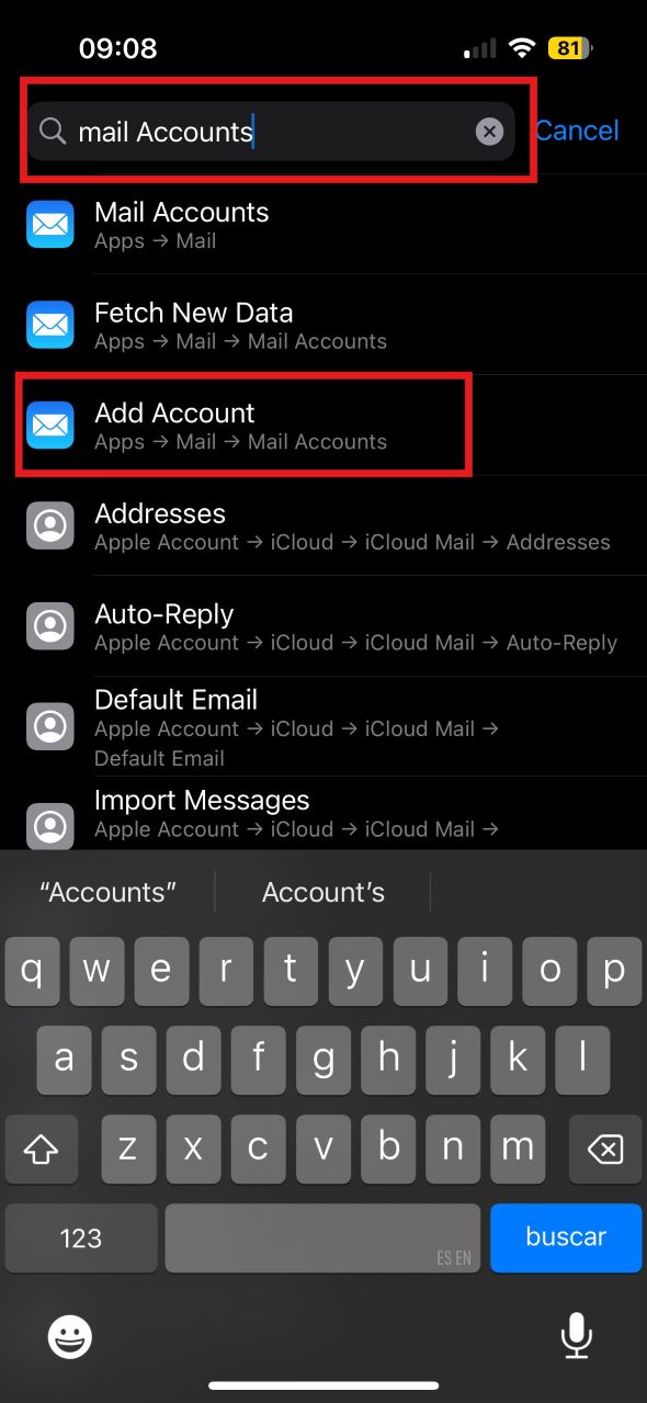 1. Open your iPhone’s Settings app. At the top of the app, just above your Apple ID there is a search bar. Search for Mail Accounts. Click Add Account