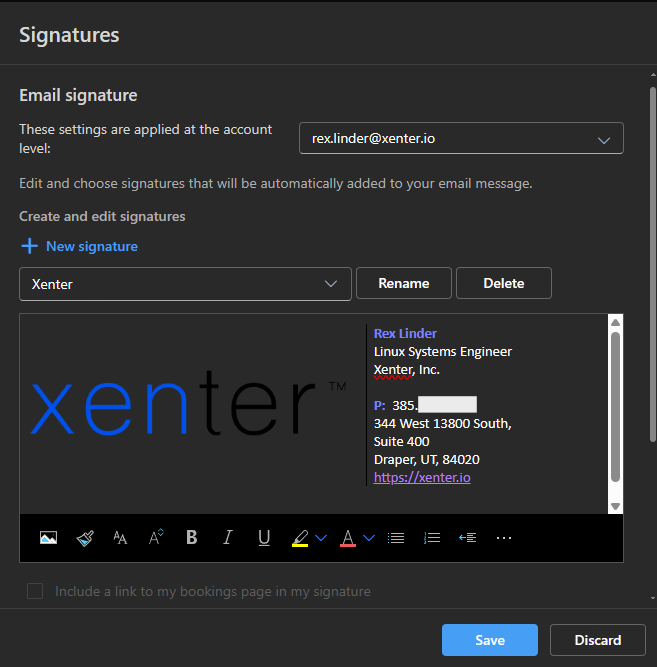 4. Give the signature the name Xenter and then copy and paste the template into the signature box. Update the name, job title, and phone number accordingly.