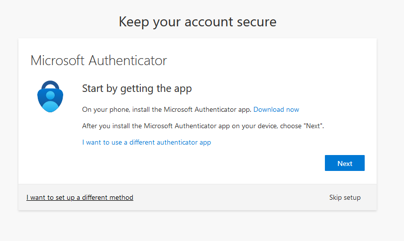6. On the next screen it will ask you to setup Microsoft Authenticator for managing multifactor authentication. Click Next until you see a QR code.