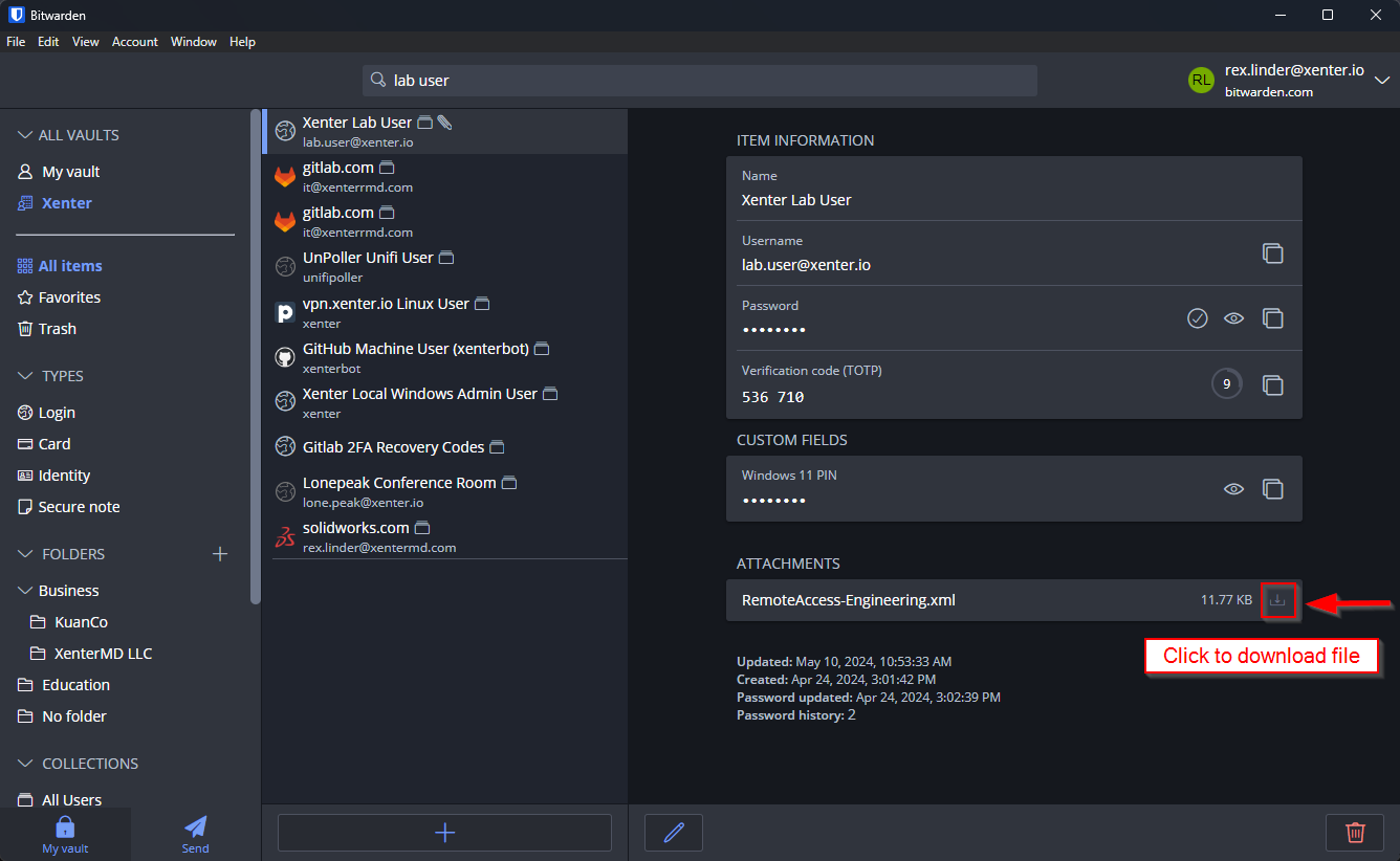 Lab PC’s can be accessed using a shared AzureAD user account: lab.user@xenter.io. The username, password, and 2FA for the user are located in the corporate password manager and shared with all members of the Engineering team. The password manager also has an attachment called RemoteAccess-Engineering.xml. Download that xml file as you will need it later.