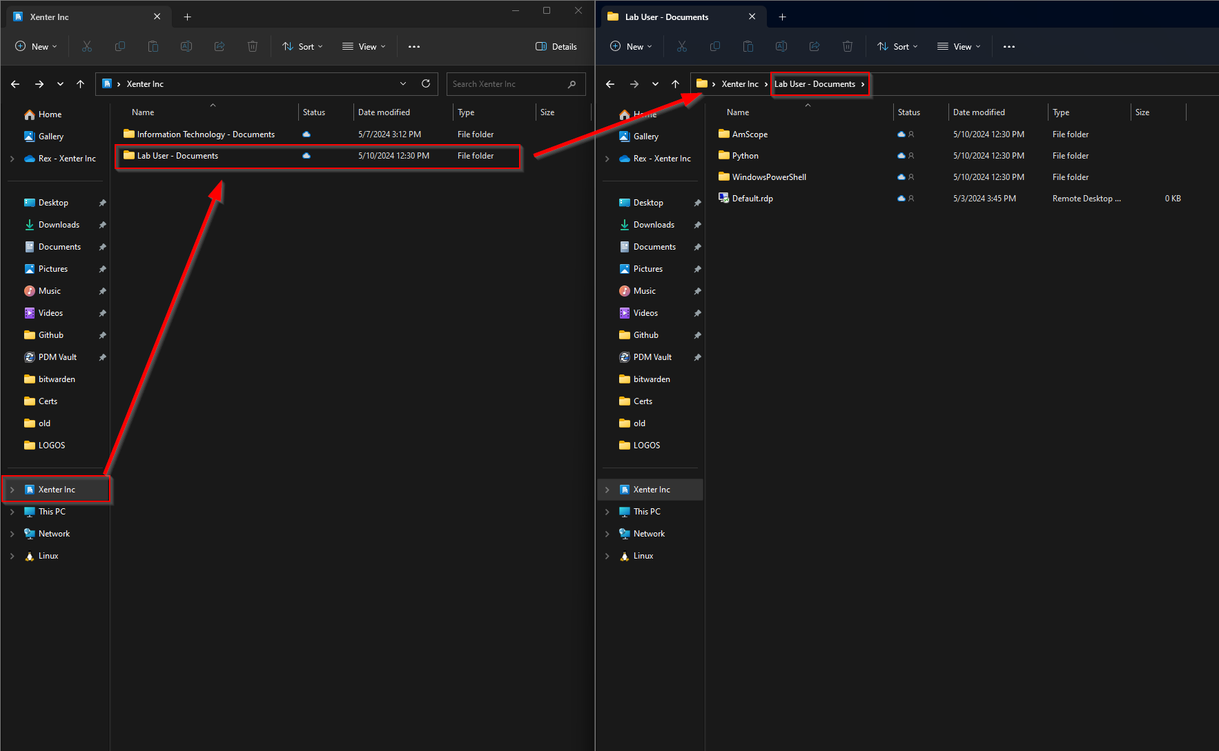 Now you will have a new section in your file explorer window to access the lab user’s documents folder from your own PC.